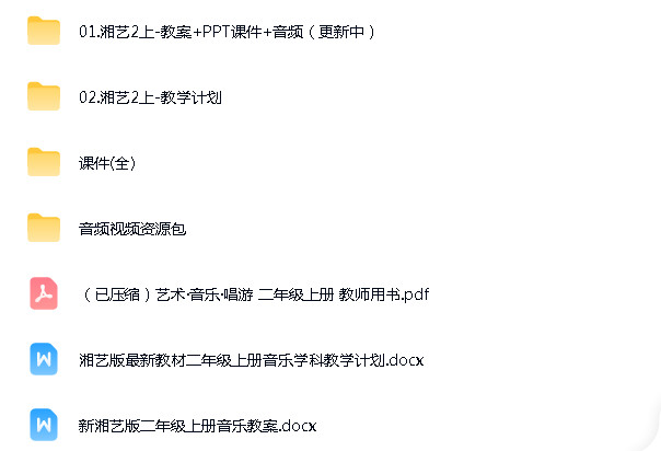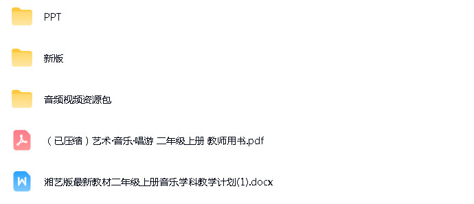 资源名称:湘文艺版(2024)小学音乐二年级上册(2024)成套ppt课件+教案+音频视频素材+PDF电子课本汇编